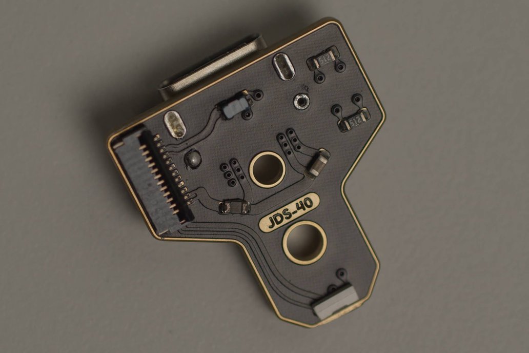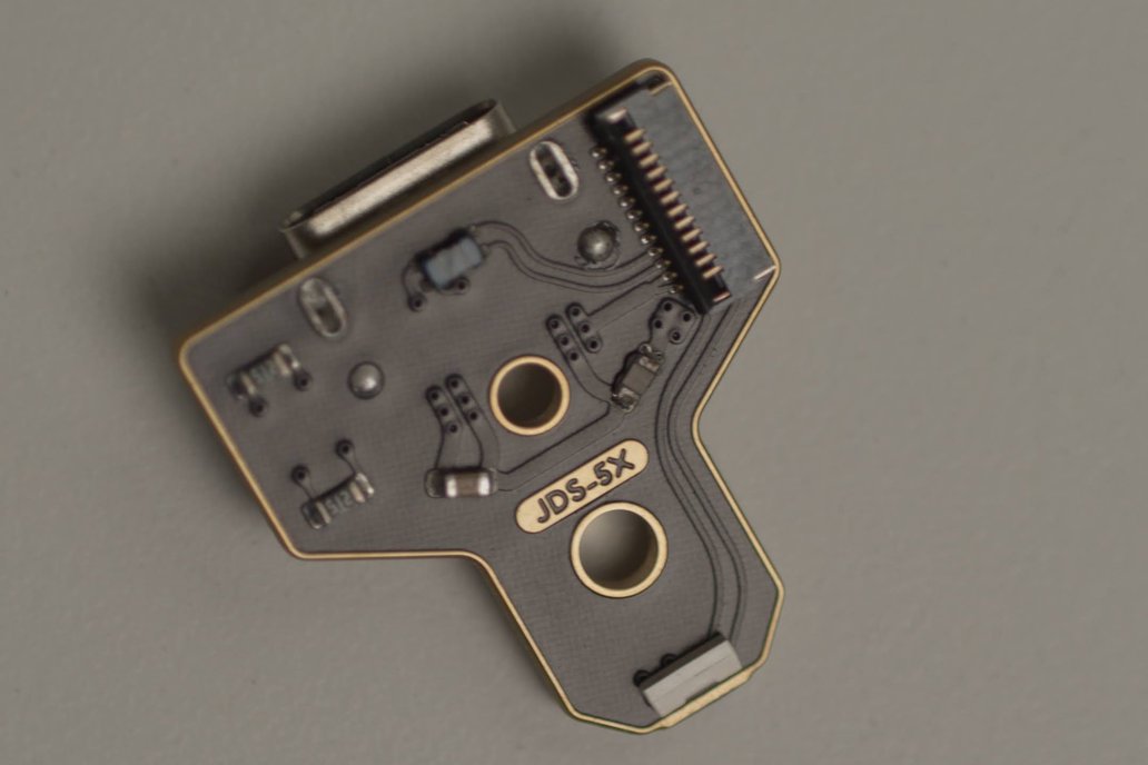 This custom circuit board has the latest standard USB connector, USB-C. It replaces the original USB-micro circuit board in the PS4 controller.